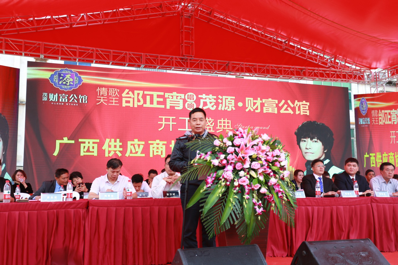 全国工商联五金机电商会副会长、广西五金机电商会会长、南宁东博国际五金机电城董事长梁勇致辞时介绍,广西茂源公司是一家实力雄厚,务实奋进的企业,除了在平南县开发茂源财富公馆和大安天利和财富广场、商业广场项目以外,在南宁、灵山、浦北等地也成功开发了一批商住地产项目,已发展成为企业总资产达20多亿元,开发面积逾200万㎡以上,并已成为横跨大型房地产业、茶文化产业、医药保健品行业、煤矿业、金融业、 酒店业、建材机电业和商贸流通业等于一体的大型综合企业。